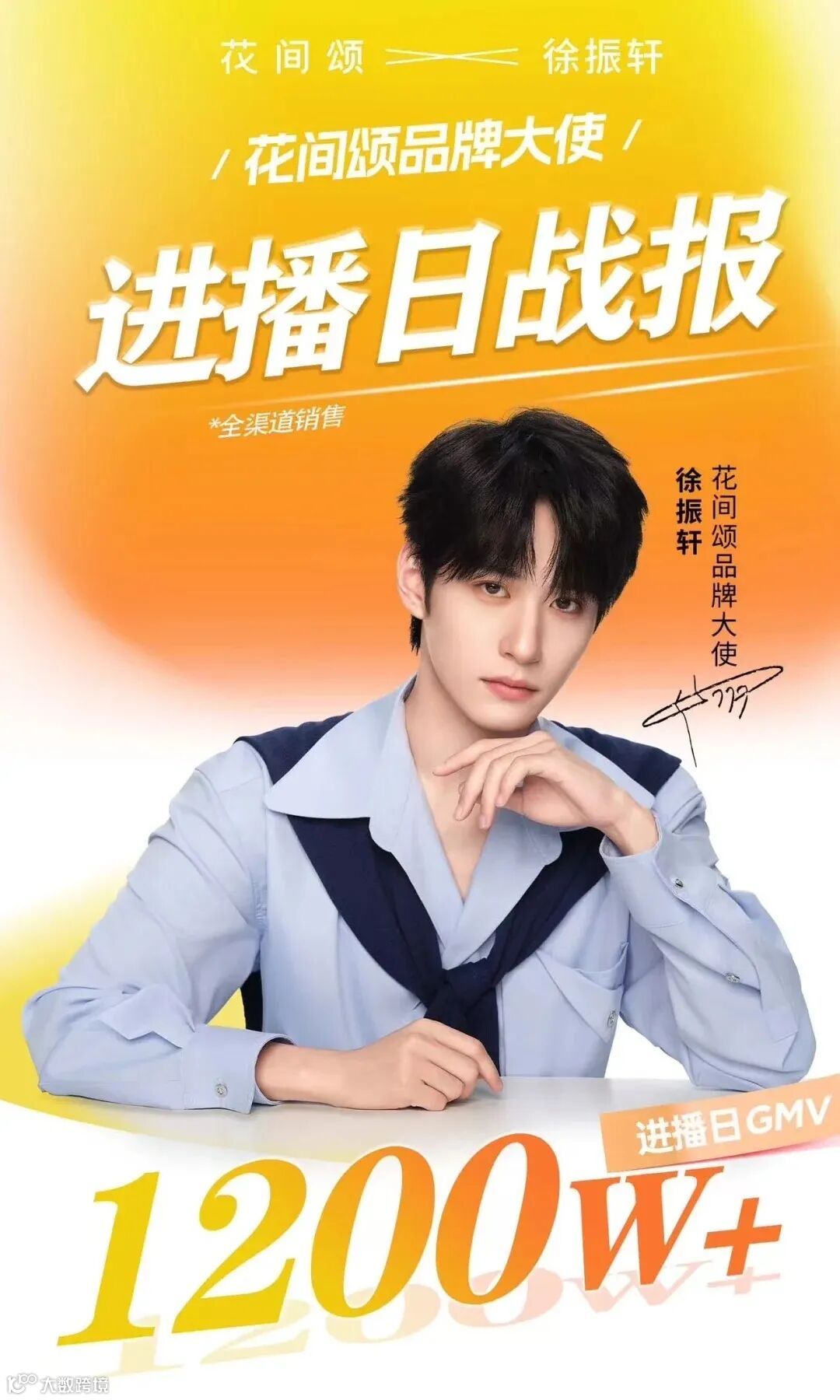 “翻台率”高了,“营业额”自然也就随之提升。花间颂公开过的战报就是实实在在的数据佐证:翟潇闻官宣单周GMV破2000万、丞磊官宣14小时后GMV突破1000万、徐振轩进播日GMV达1200万+。