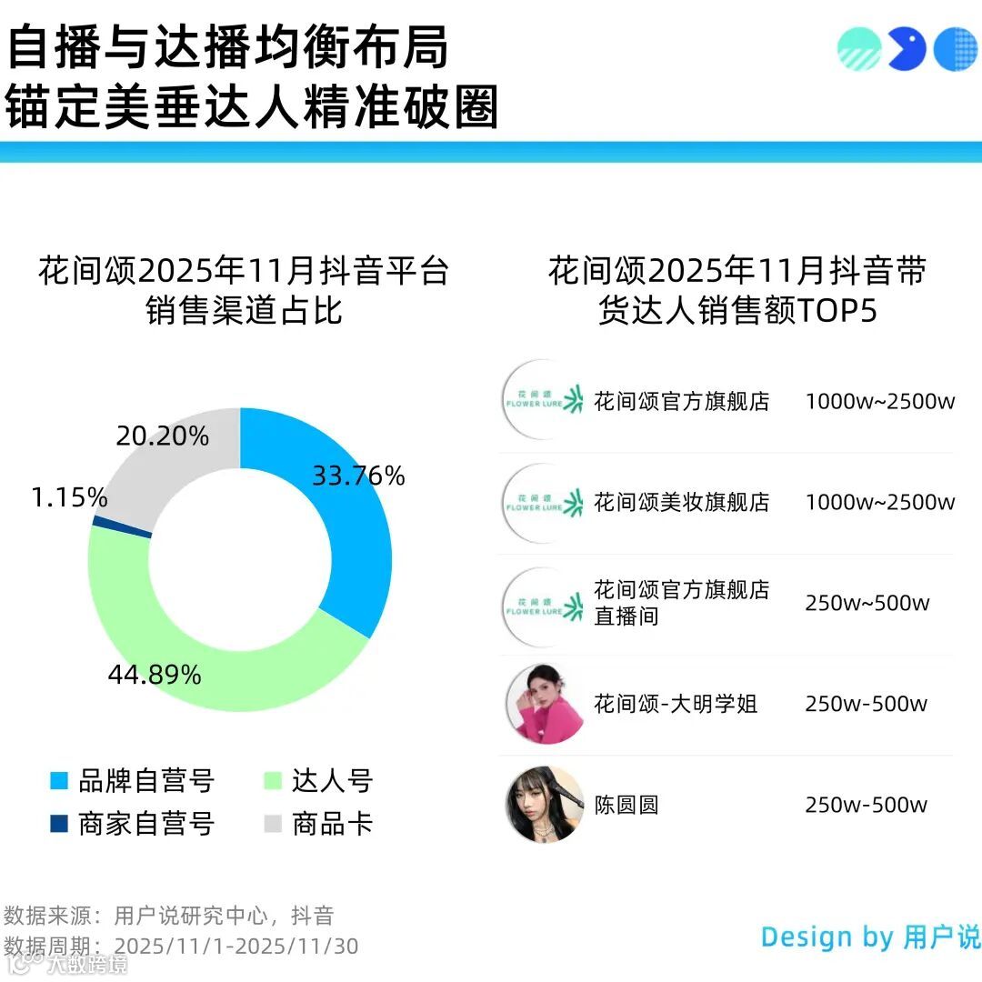 观察目前花间颂的销售渠道,可发现其各渠道皆有布局且较为均衡,没有出现“偏科”的情况。以11月的业绩为例,花间颂11月共实现1亿+的销售额,其中品牌自营号2500万-5000万,占比33.76%;达人号2500万-5000万,占比44.89%,两者比重差距较小。