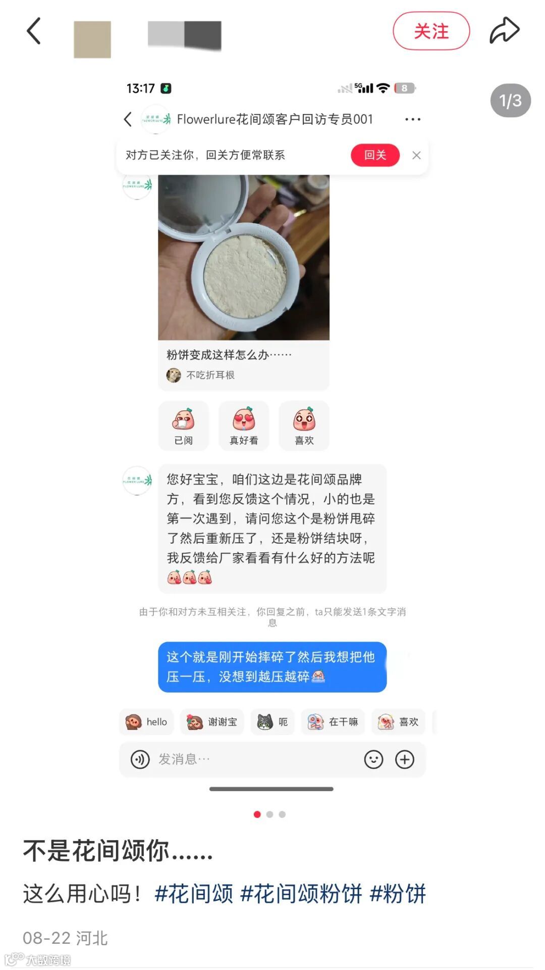 对此类问题,花间颂及时响应,通过客服回复、产品补发等做法,及时安抚消费者的情绪,同时为品牌积累正向口碑。在商品评论区,客服会告诉买家“可以尝试用棉签或纸巾擦去结块部分”,在小红书上,也有消费者晒出花间颂主动售后的私信,并称赞“花间颂这么用心”。