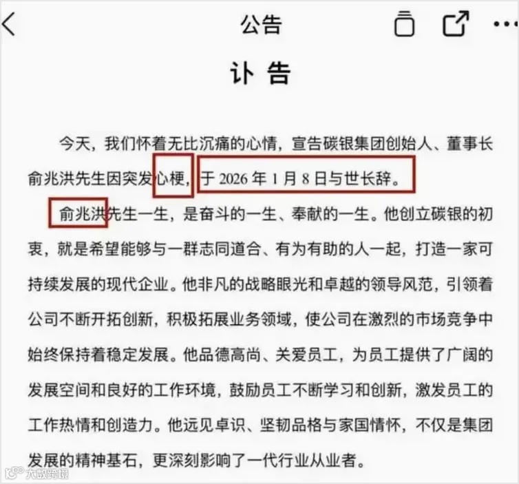 近日,浙江商界传来悲痛消息,知名企业家、浙江碳银数智绿能科技有限公司董事长俞兆洪突发心肌梗死去世,年仅48岁。