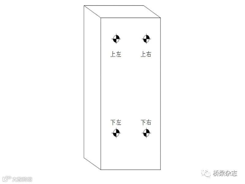 每根桥墩布设4个观测点(如图1):桥墩上下位置各一对,上下点位安装时应尽可能和桥墩中轴线平行,下点位高于地面3米的位置,避免观测时地面地物的遮挡及被破坏,左右两点距离大于5米,上下点位间距20-30米,点位布置时需考虑周边环境的影响,便于观测人员照准。
