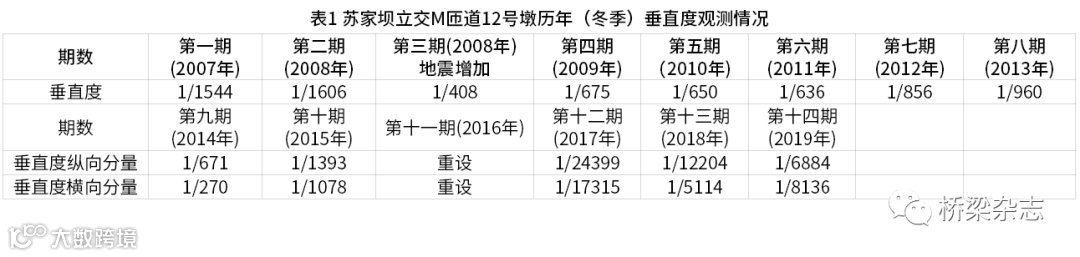 从以上对比分析来看,该方案根据历年观测数据、现场实际情况以及长远考虑的数据统一性制定,重新定义了高墩垂直度的观测方法,采用新的照准标志与计算方法,不仅简单易行可靠,而且大幅度消减了测量人员照准误差、不同测量人员的观测误差、不同位置建立观测站对观测结果的影响,使垂直度观测方法及成果的统一性得到控制,提高了成果精度与灵敏度(大约从1:2000提升至1:20000)。同时,当期采用了本方法和传统观测方法相结合的方式,对垂直度数据进行计算分析比对,严格意义上保证了数据的延续性。