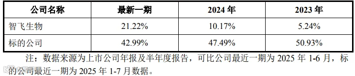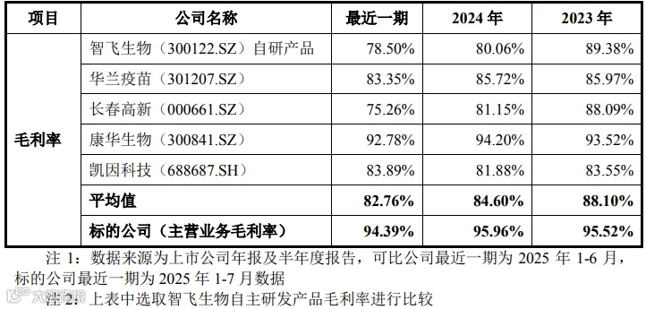 如上表所示,标的公司的竞争对手智飞生物自研产品及其他同行业可比上市公司的毛利率均较高。