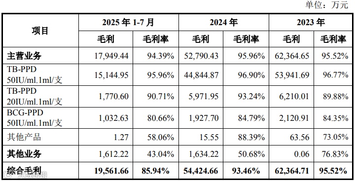 草案显示,报告期内,标的公司主营业务毛利率分别为95.52%、95.96%和94.39%,主要系标的公司TB-PPD为独家产品。