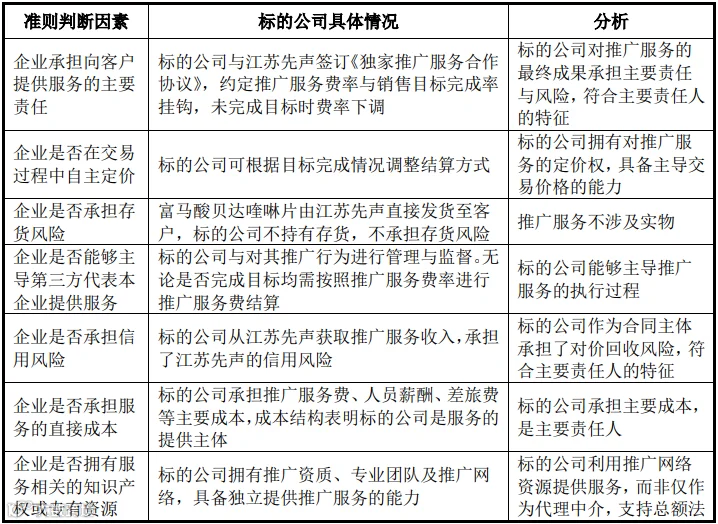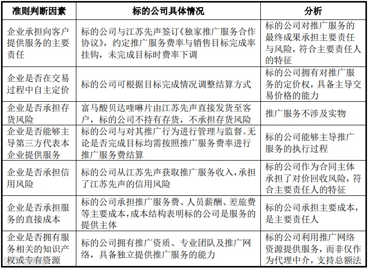 标的公司为江苏先声提供销售推广服务,并非从事贸易业务。根据双方确认的推广服务费金额按江苏先声实现销售金额乘以对应销售推广费率确认收入,标的公司将为江苏先声提供销售推广服务承担的人员费用、次级推广服务商费用计入对应成本。根据《企业会计准则第14号——收入》第三十四条,标的企业收入确认政策分析情况如下表所示:
