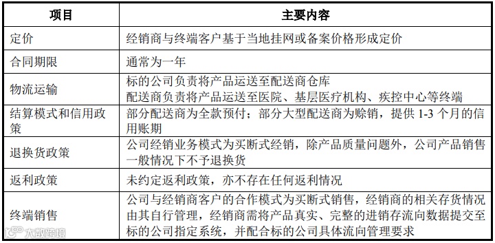 标的公司将产品销售给配送商,再由配送商销售给各级医院、基层医疗机构、疾控中心等应用终端。配送商主要为具有较强配送能力、资金实力和商业信誉的全国性或区域性医药流通企业,承担药品配送职能。