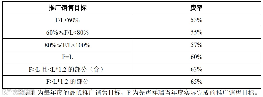 先声祥瑞与江苏先声约定的推广服务费率为阶梯式,当先声祥瑞达成年度设置的推广目标,将按60%费率支付推广费;超过推广目标但低于120%的部分按照63%支付推广费用;超过120%的部分按照65%支付推广费用,具体费率确定方式约定如下: