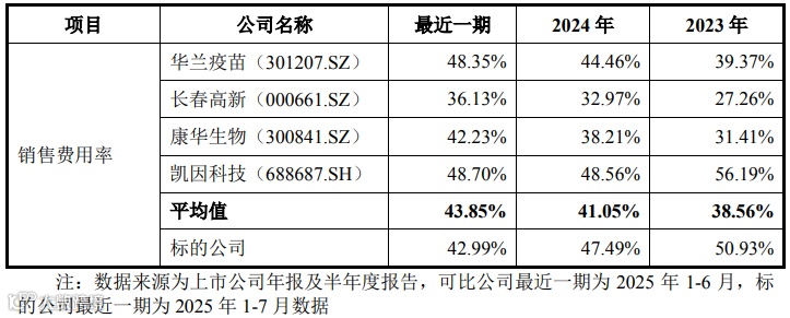 报告期内,标的公司销售费用率与华兰疫苗、康华生物、以及凯因科技基本一致,其中较高于长春高新,主要是长春高新其核心产品生长激素独特属性(需要长期用药、患者(家长)品牌忠诚度高、转换成本高)且业务规模较大(2024年营业收入为134.66亿元)所致。