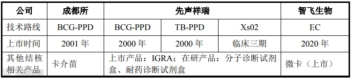 标的公司的TB-PPD为独家品种。该产品来源于我国唯一的结核分枝杆菌强毒株,具有稀缺性,获取结核分枝杆菌强毒株的技术难度大、耗费时间长、不确定性高。1980年WHO赠送给中国食品药品检定研究院(中检院)源于丹麦血清研究所的结核分枝杆菌原始强毒株,中检院成为我国唯一保存结核分枝杆菌原始强毒株的单位。中检院在总结国外的酸变性沉淀法和盐析法的优点基础上进行改进,建立了酸变性加盐析的PPD综合制备方法,由结核分枝杆菌强毒株(H37RV)培养滤液中提取的蛋白研制出TB-PPD 80-1。1984年TB-PPD 80-1确定为国家标准参考品。此后,中检院将强毒株及相关技术独家转让给公司,因此标的公司为TB-PPD国内唯一生产厂家。与标的公司的TB-PPD产品直接构成竞争关系的产品、竞争对手如下表所示: