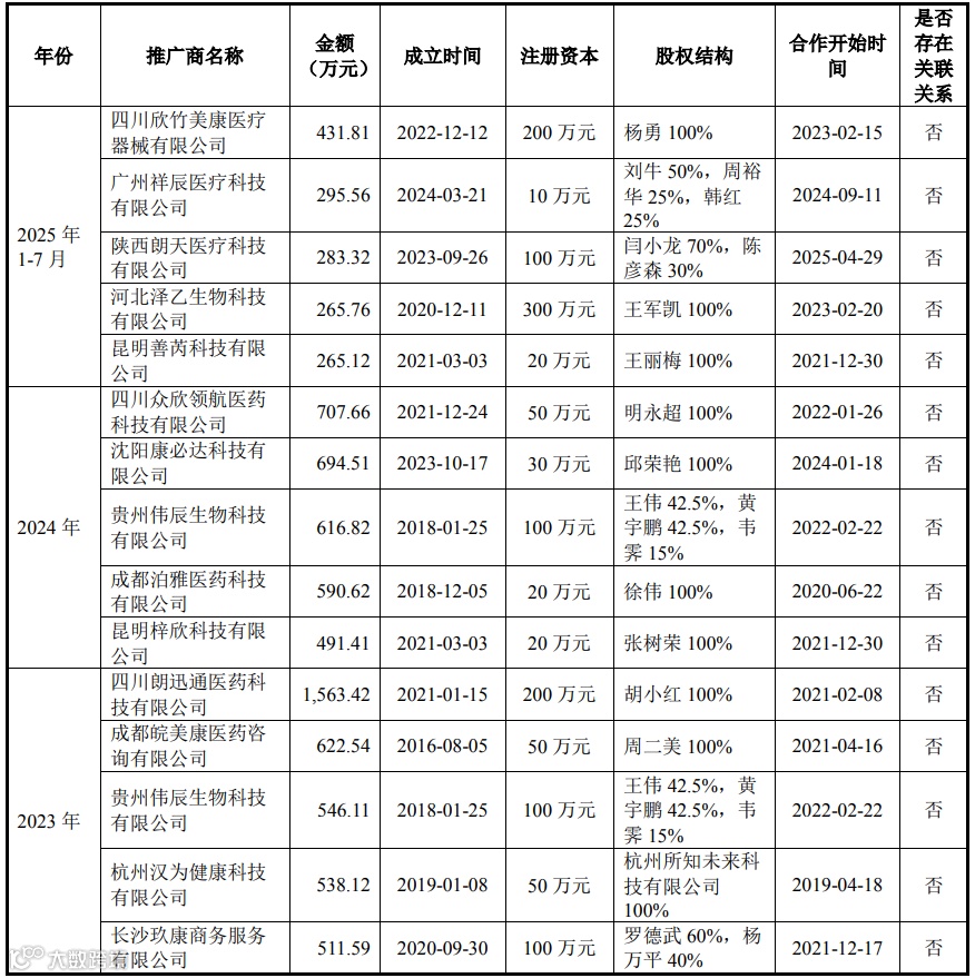 云南省医药有限公司为2023年前十大经销商,2024年、2025年1-7月成为前五大经销商,变动具有合理性。