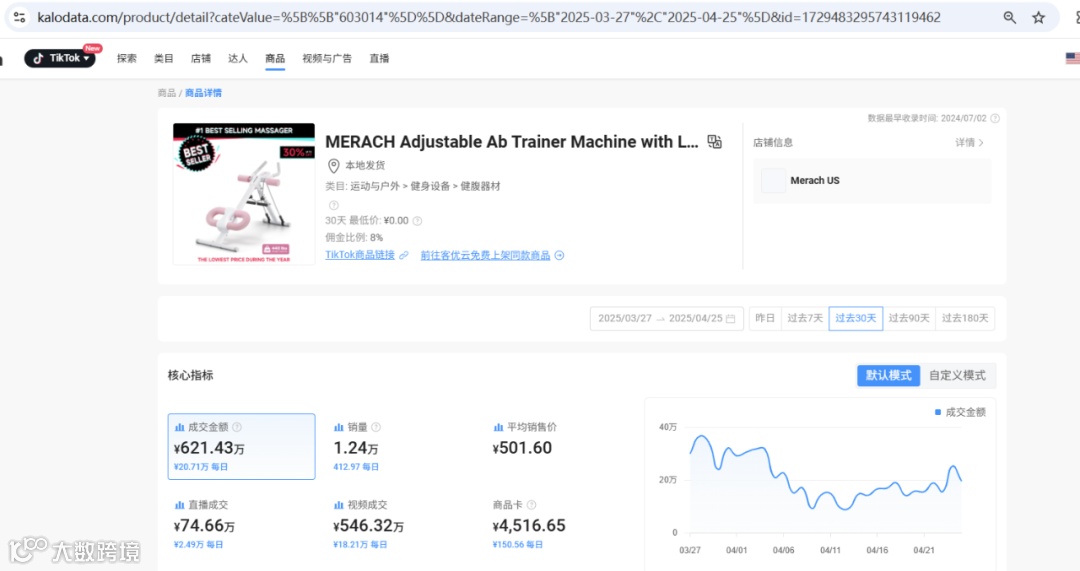 图源:merach众多产品中,一款可调节腹部训练器表现尤为突出。kalodata数据显示,该产品售价69.99美元,近30天,售出超1.24万件,成交额达621.43万元,位列TikTok平台运动与户外类目第二。