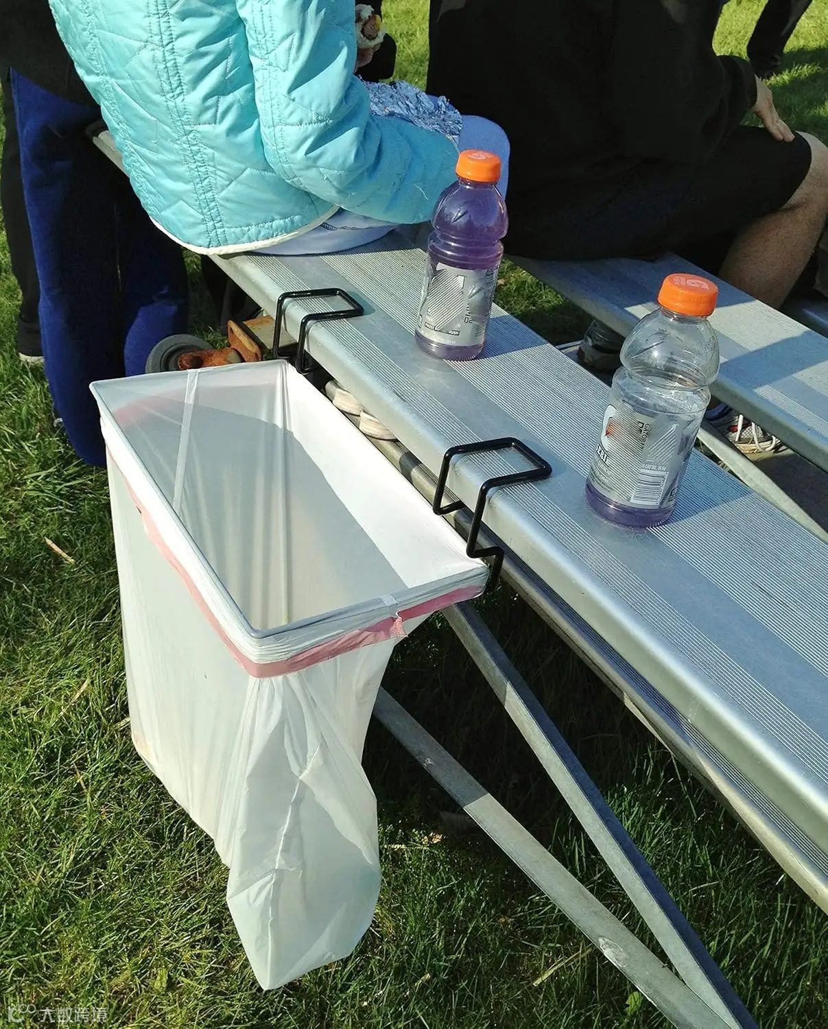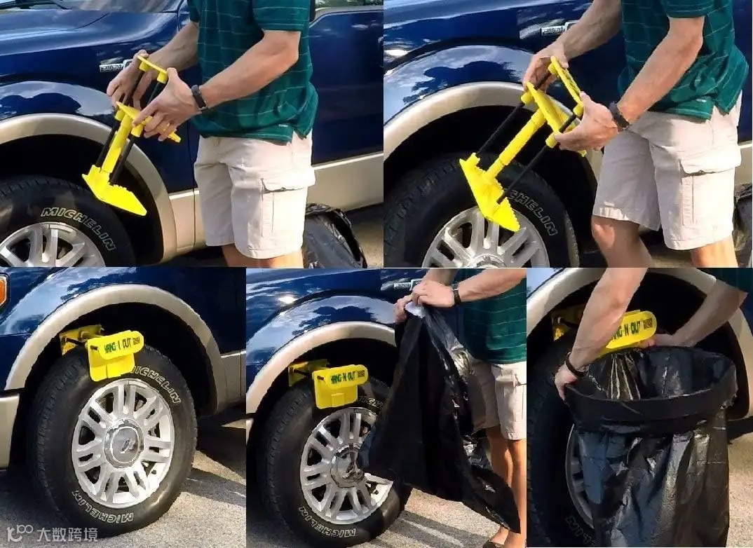 夹在轮胎上固定,实际上就是一个夹住轮胎的塑料件加一个投篮框一样的大圆环,将垃圾袋套在圆环上,车胎用作支撑。解决了户外露营丢垃圾麻烦的问题,与常规的可折叠垃圾桶相比它使用起来更方便,携带更轻便,收纳占面积也更小,对户外活动友好。