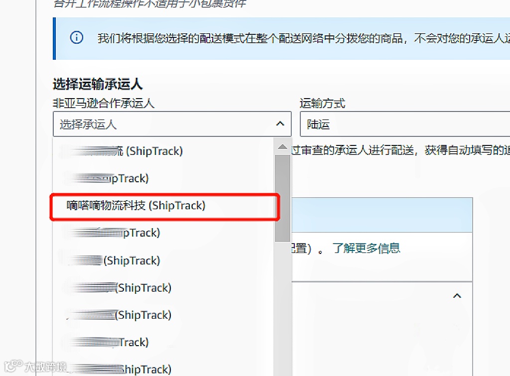 在第四步中,ShipTrack 承运商会显示在选择承运人的下拉列表里,下拉“选择运输承运人”列表,点击“嘀嗒嘀物流科技(ShipTrack)”。