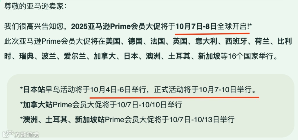 2025年亚马逊秋季Prime Day将于10月7日-8日举行,覆盖美国、德国、法国、英国、加拿大、澳大利亚等16个站点。