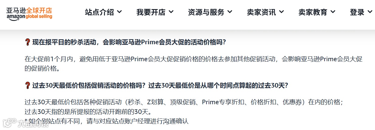 严禁先涨价后打折,大促价格不得高于过去30天内所有活动的最低价格,秒杀、Z划算、顶级促销、Prime专享折扣、价格折扣、优惠券等都算入最低价格计算范围。
