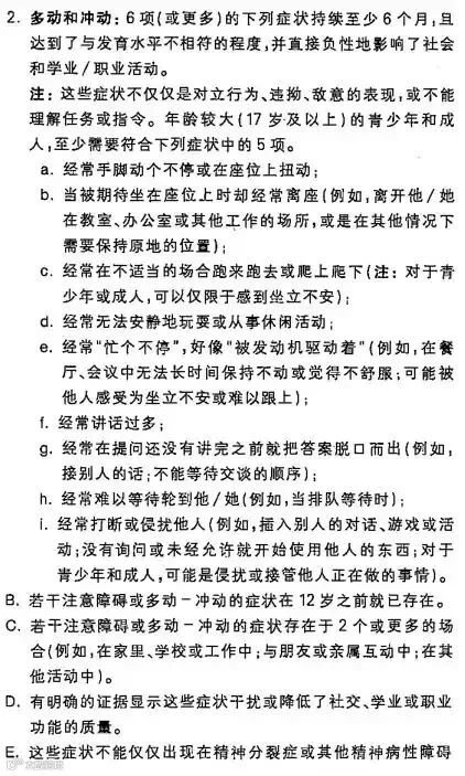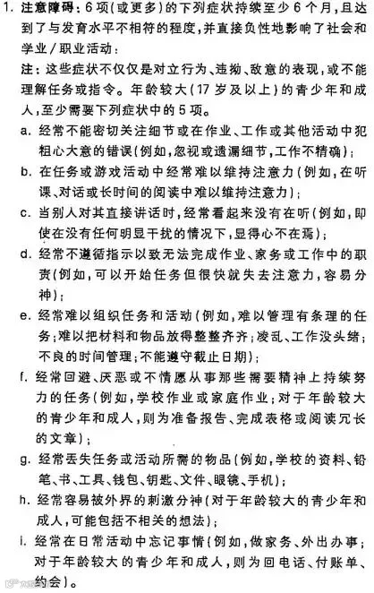 - 症状数量:17岁以下需满足注意力缺陷或多动冲动维度中至少六项;17岁及以上则需至少五项,且与年龄发展水平不符。