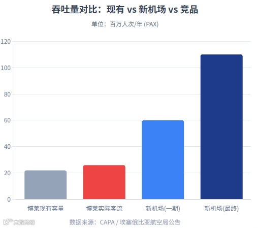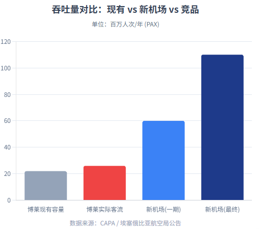 埃塞俄比亚航空(ET)为非洲最具竞争力航司,但现有博莱国际机场(ADD)已成为发展瓶颈:地处亚的斯亚贝巴市中心,扩建空间几无;更关键的是其2334米高海拔带来三重制约: