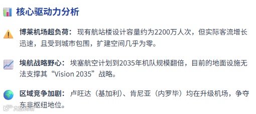 | 开罗 | CAI | 庞大腹地市场;低海拔 | 设施老化;中转撒哈拉以南不便 | 规划新航站楼 |