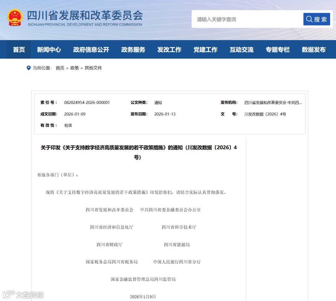 2026年1月,四川省形成数字经济发展“双政策支撑”格局:1月9日,省发展改革委联合省委金融办、经信厅等9部门印发《关于支持数字经济高质量发展的若干政策措施》(川发改数据〔2026〕4号,下称《若干措施》),1月8日召开《四川省国家数字经济创新发展试验区建设方案》(下称《试验区方案》)新闻通气会,标志着四川继2019年首次入选后,新一轮国家数字经济创新发展试验区建设进入实质性阶段。