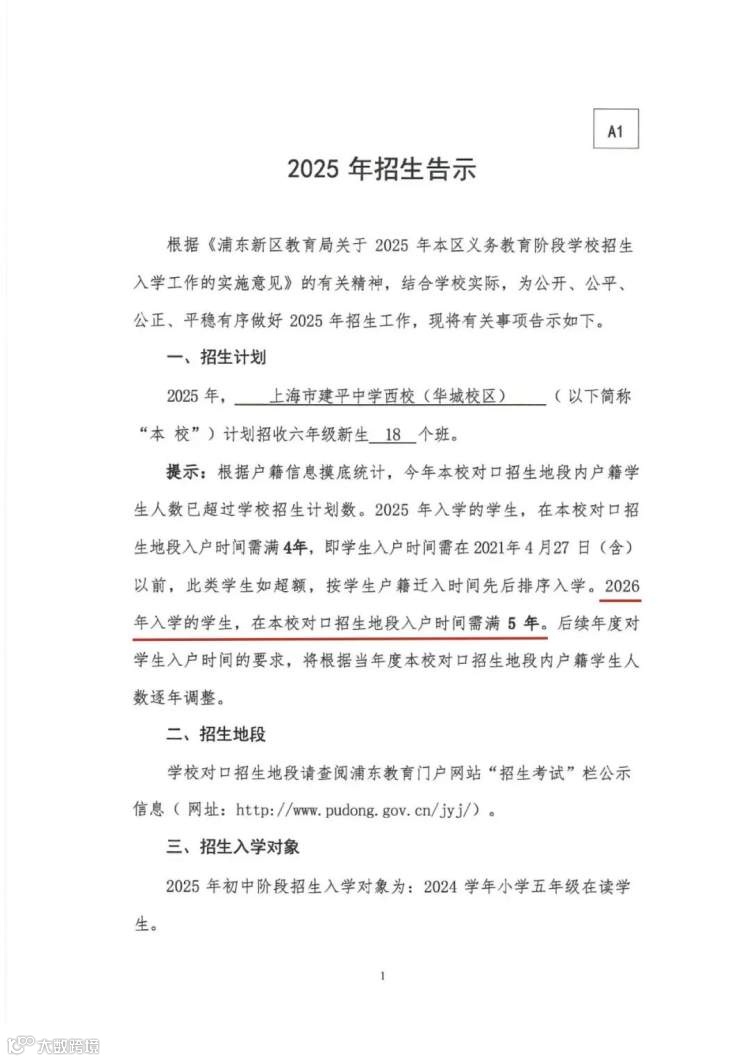 建平中学西校(华城校区)在2025年的招生告示中明确,2026年入学的学生,在本校对口招生地段入户时间需满5年。