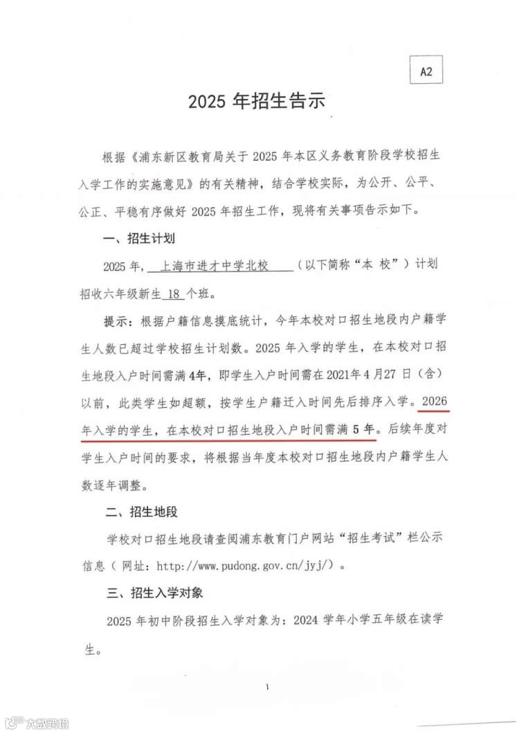进才中学北校在2025年招生告示中明确,2026年入学的学生,在本校对口招生地段入户时间需满5年。