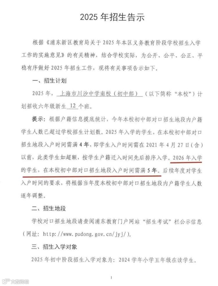 川沙中学南校(初中部)在2025年招生告示中明确,2026年入学的学生,在本校初中部对口招生地段入户时间需满5年。