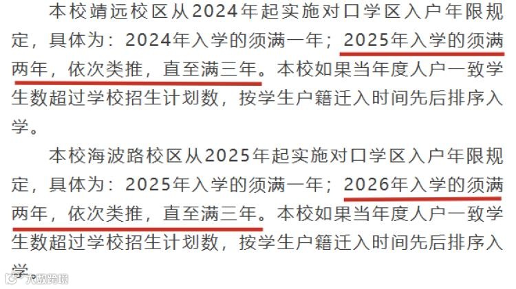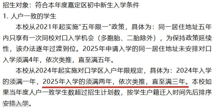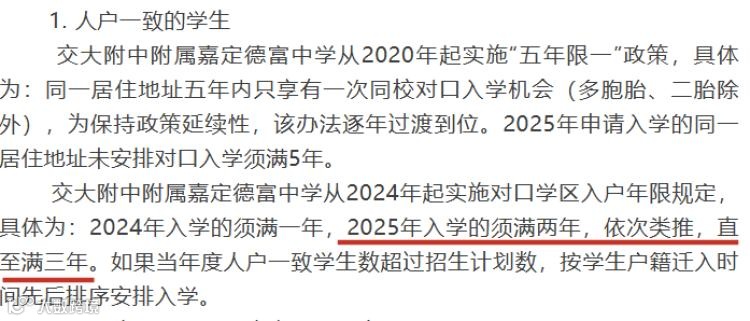 交大附中附属嘉定德富中学在2025年招生简章中明确,2025年入学的须满两年,依次类推,直至满三年。如果当年度人户一致学生数超过招生计划数,按学生户籍迁入时间先后排序安排入学。