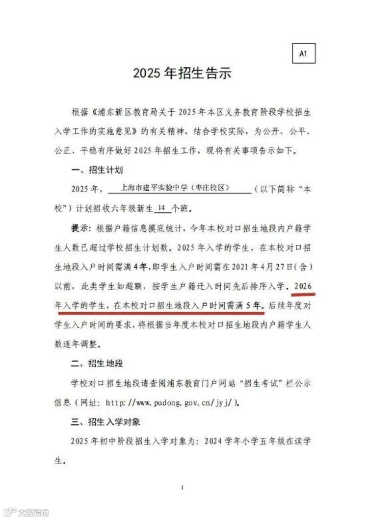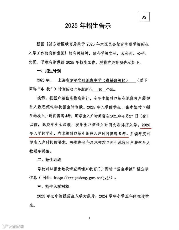 建平实验地杰中学(御桥路校区)在2025年的招生告示中明确,2026年入学的学生,在本校对口招生地段入户时间需满5年。