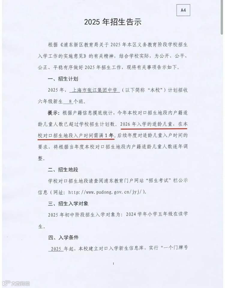 在张江集团中学2025年招生告示中明确,今年学校对口招生地段内户籍适龄儿童人数已超过招生计划数。2026年入学的适龄儿童,在本校对口招生地段入户时间需满1年。