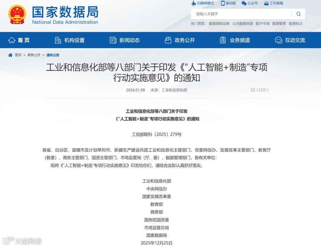 2025年12月25日,工业和信息化部联合中央网信办、国家发展改革委、教育部、商务部、国务院国资委、市场监管总局、国家数据局等八部门印发《“人工智能+制造”专项行动实施意见》(以下简称《意见》),明确以“人工智能技术与制造业应用双向赋能”为核心主线,为数据局政企条线提供了从技术筑基到生态落地的全流程工作框架。《意见》锚定2027年关键目标,量化拆解七大重点任务及21项具体措施,并配套《人工智能赋能制造业重点行业转型指引》《制造业企业人工智能应用指南》两大附件,是数据局推动区域制造业智能化转型、培育新质生产力的核心政策依据。