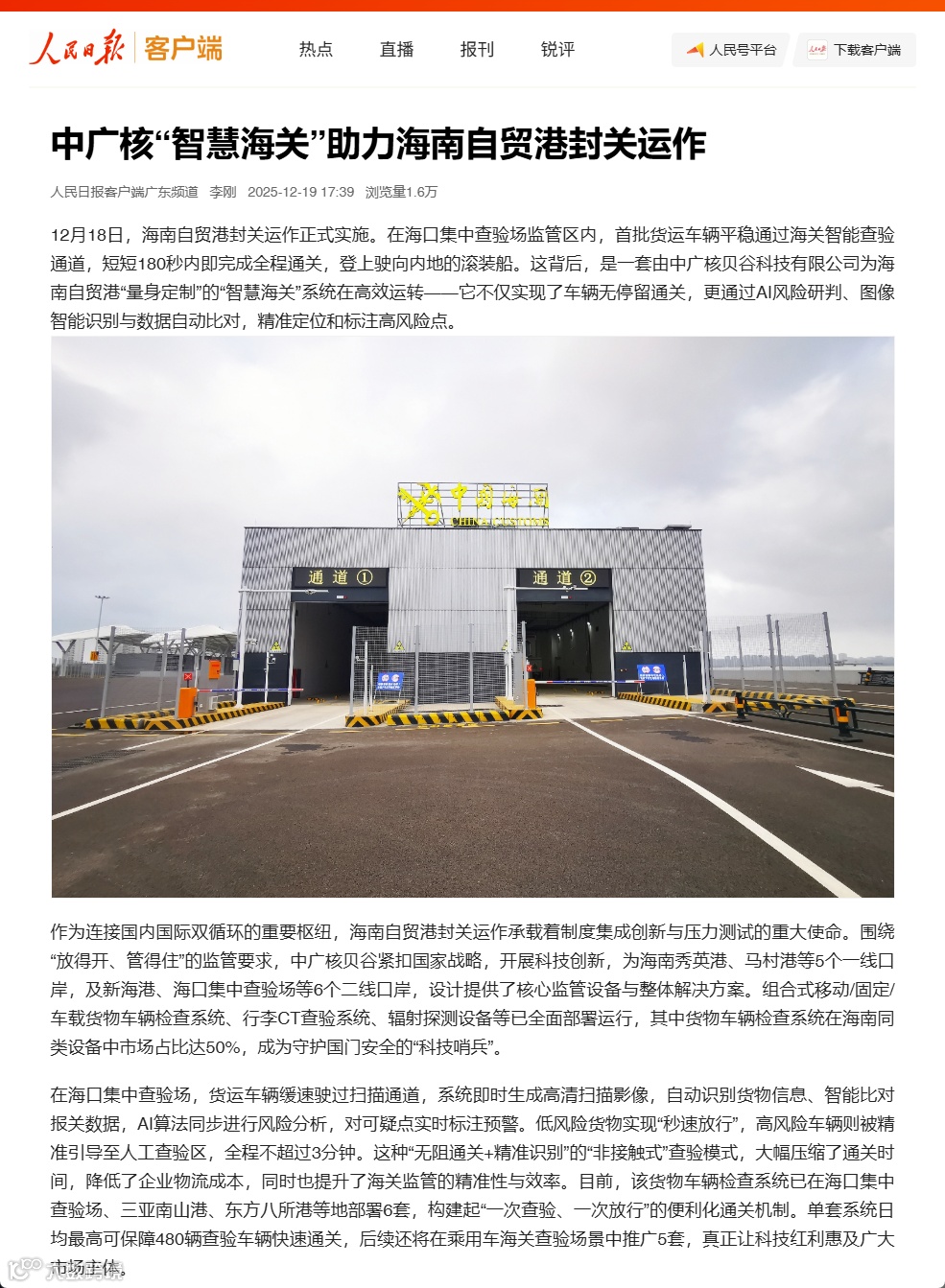 12月18日,海南自贸港封关运作正式实施。这背后,由中广核贝谷为海南自贸港“量身定制”的“智慧海关”系统在高效运转——它不仅实现了车辆无停留通关,更通过AI风险研判、图像智能识别与数据自动比对,精准定位和标注高风险点。相关内容,获人民日报、新华社、科技日报、中国新闻网等20余家主流媒体聚焦报道。