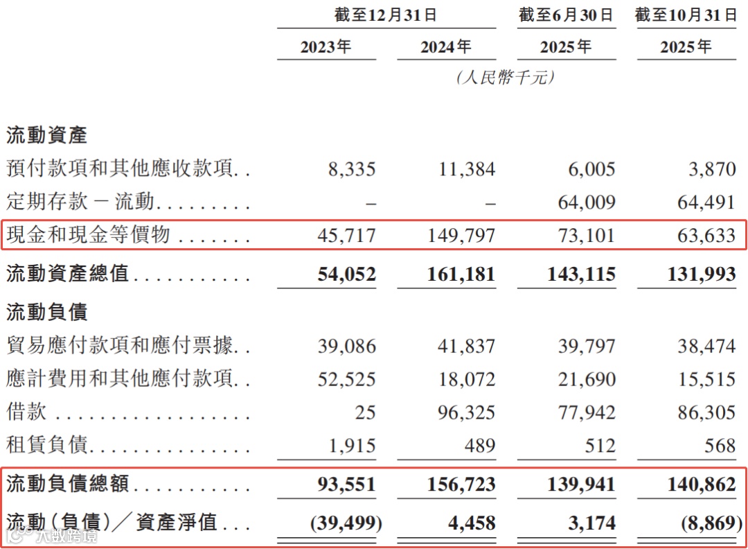 在营运资本方面,公司的现金储备一般,截至2025年10月31日,现金及其等价物为6363万元。同时,公司的负债水平偏高,截至同期,流动负债总额为1.4亿元,流动负债净额为887万元。