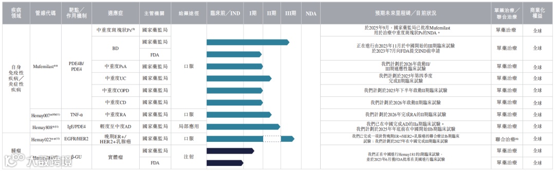 除了中重度斑块状银屑病外,Mufemilast正针对5类自身免疫性疾病推进临床试验,包括白塞病(III期招募中,预计2026年5月完成)、强直性脊柱炎(已完成II期)、溃疡性结肠炎(已完成II期)、特应性皮炎(II期进行中)、银屑病关节炎(I期/II期进行中)等。