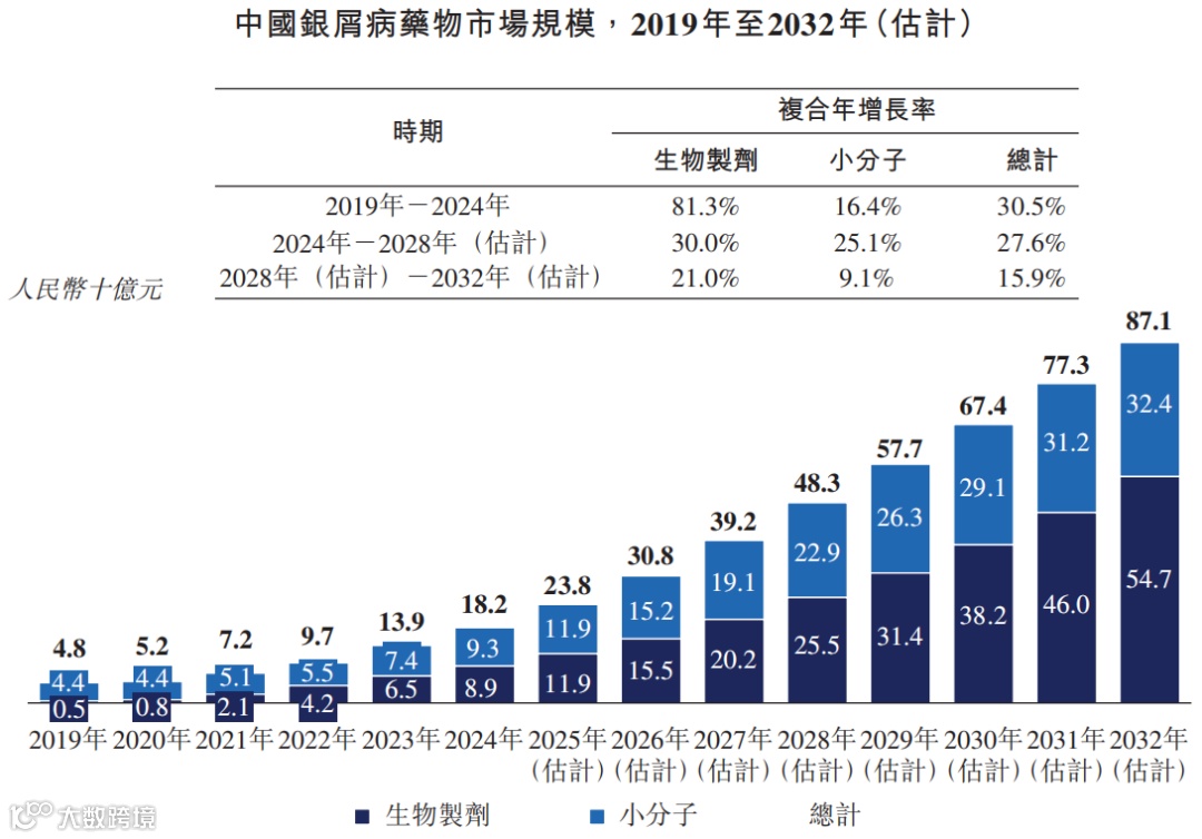 据弗若斯特沙利文数据,中国银屑病药物的市场规模持续增长,从2019年的48亿元增至2024年的182亿元,复合年增长率为30.5%,后续预计将以27.6%的速度增至2028年的483亿元,到2032年这个数字有望达到871亿元。
