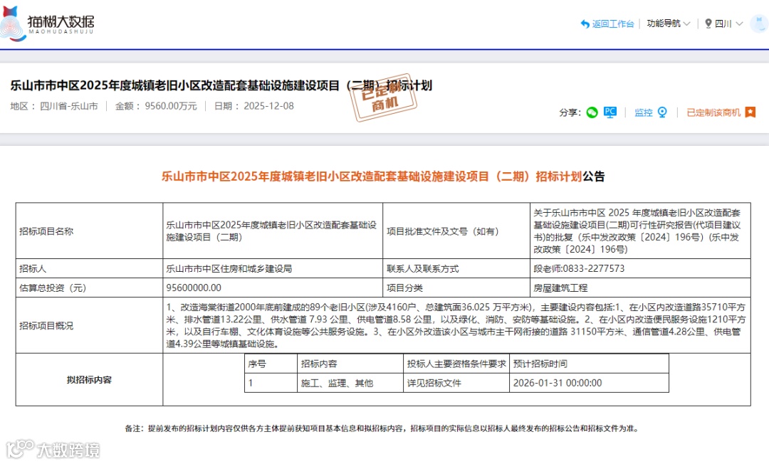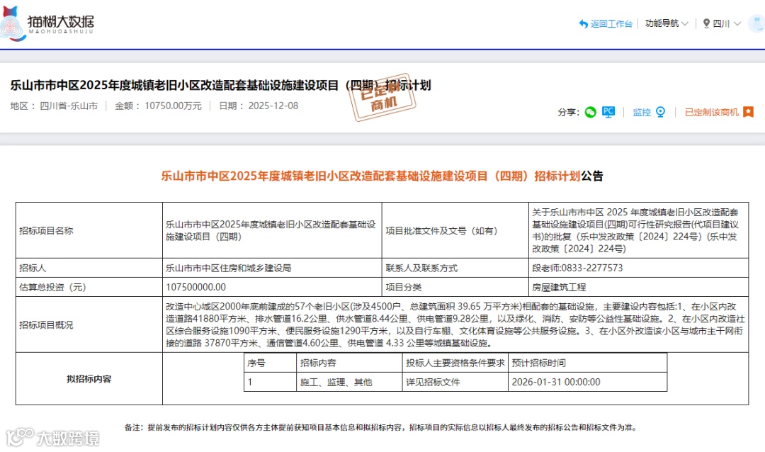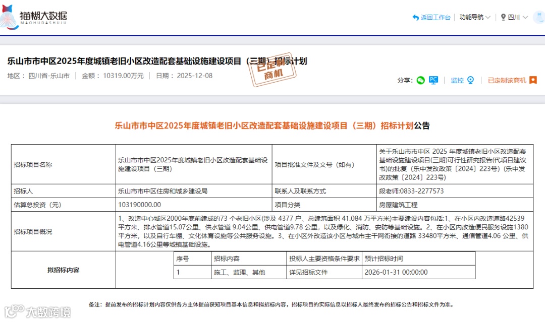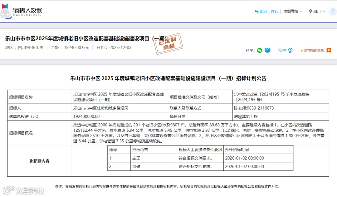 2025年12月,四川省公共资源交易信息网密集发布乐山市市中区2025年度城镇老旧小区改造配套基础设施建设项目(一期至四期)招标计划,总投资近5亿元!项目覆盖中心城区数百个老旧小区,涉及道路、管网、公共服务设施等全方位改造,为建筑行业企业送上新年第一波“政策红利”。