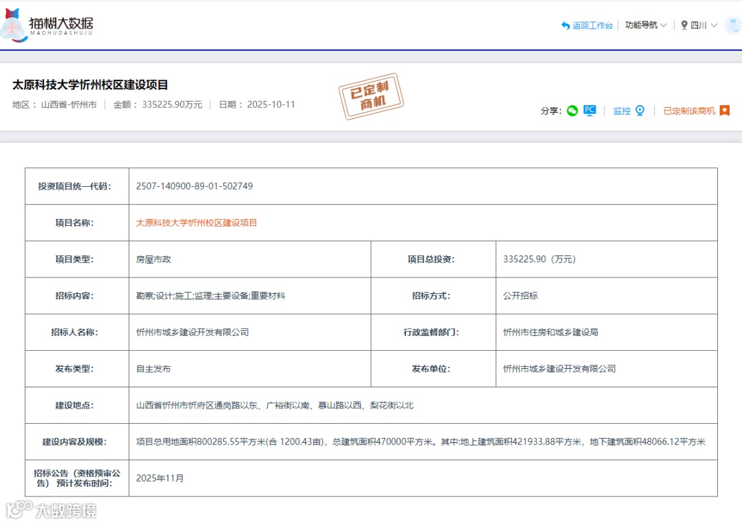2025年10月11日,全国公共资源交易平台(山西省)发布太原科技大学忻州校区建设项目招标计划。该项目总投资33.52亿元,涵盖勘察、设计、施工、监理及设备材料采购等全流程招标,为建筑行业企业提供了涵盖多领域的商业机会。
