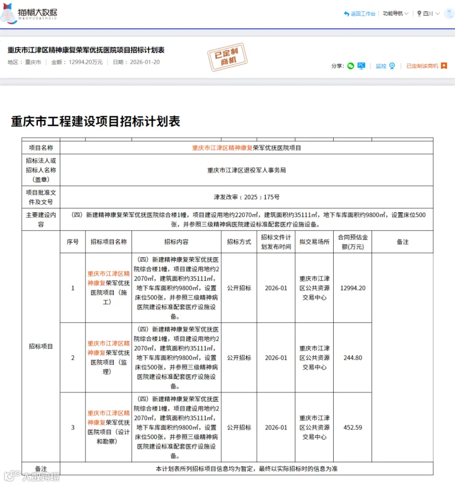 2026年1月20日,全国公共资源交易平台(重庆市)发布了重庆市江津区精神康复荣军优抚医院项目招标计划表。该项目合同预估金额约1.3691亿元,涵盖新建精神康复荣军优抚医院综合楼及配套设施建设,为建筑行业相关企业带来新的商业机会,尤其是擅长医疗建筑、综合楼建设及配套设施安装的企业。