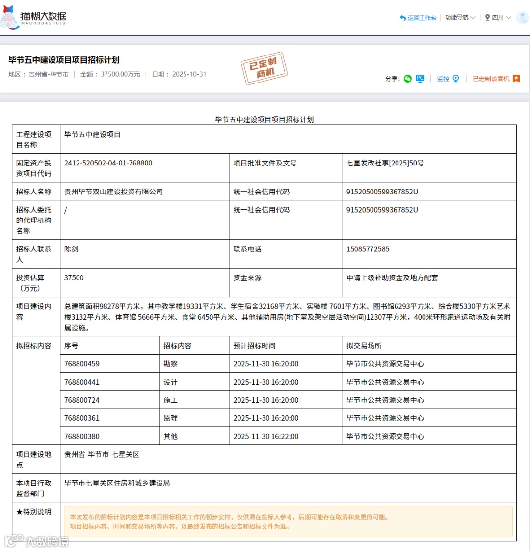 2025年10月31日,贵州省招标投标公共服务平台发布了毕节五中建设项目招标计划。该项目总投资3.75亿元,涵盖教学楼、宿舍、实验楼等9.8万平方米建设内容,为建筑行业相关企业带来重要商机。