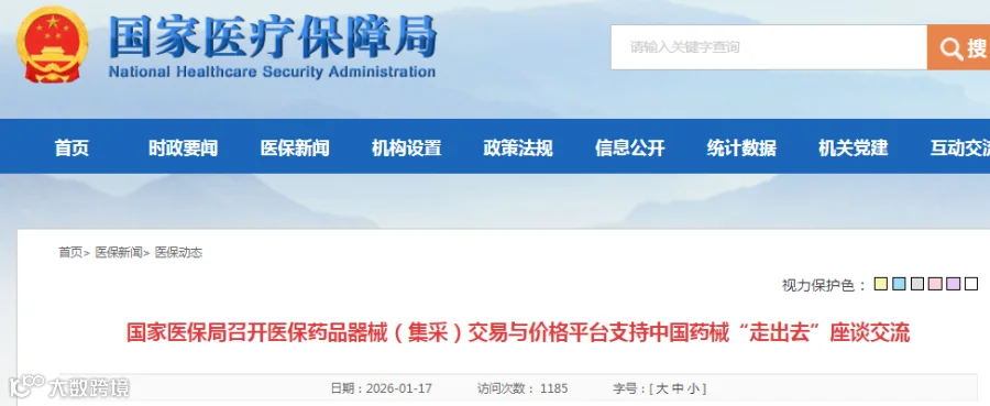 2026年1月17日,国家医疗保障局在北京召开医保药品器械(集采)交易与价格平台支持中国药械“走出去”座谈交流活动。来自国家部委、国际组织驻华机构、金融机构、药品器械(集采)交易与价格平台、药械企业、新闻媒体的代表400余人参加,围绕如何更好发挥好医保药品器械(集采)交易与价格平台功能,构建“走出去”政策和服务支持体系,开展深入交流。有关部委代表介绍了支持中国药品器械的政策措施,金融机构代表介绍了针对中国药械企业的全周期金融服务方案,药械企业代表分享了海外市场拓展与实践经验,并对平台建设提出了建设性意见。