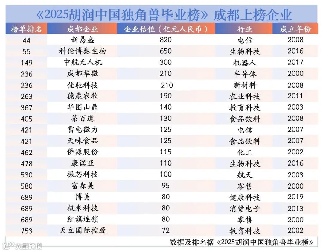 成都共有18家企业入选《2025胡润中国独角兽毕业榜》,按企业价值排名依次为: