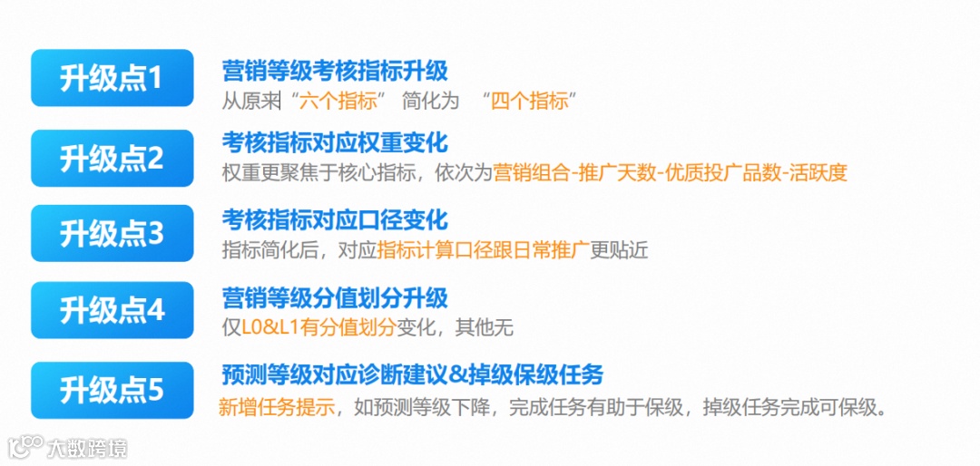 一句话概括:考核指标精简、总分权重调整、指标定义优化、新增掉级预警机制;原L1等级中(20,30)分区间,现统一划入L0。
