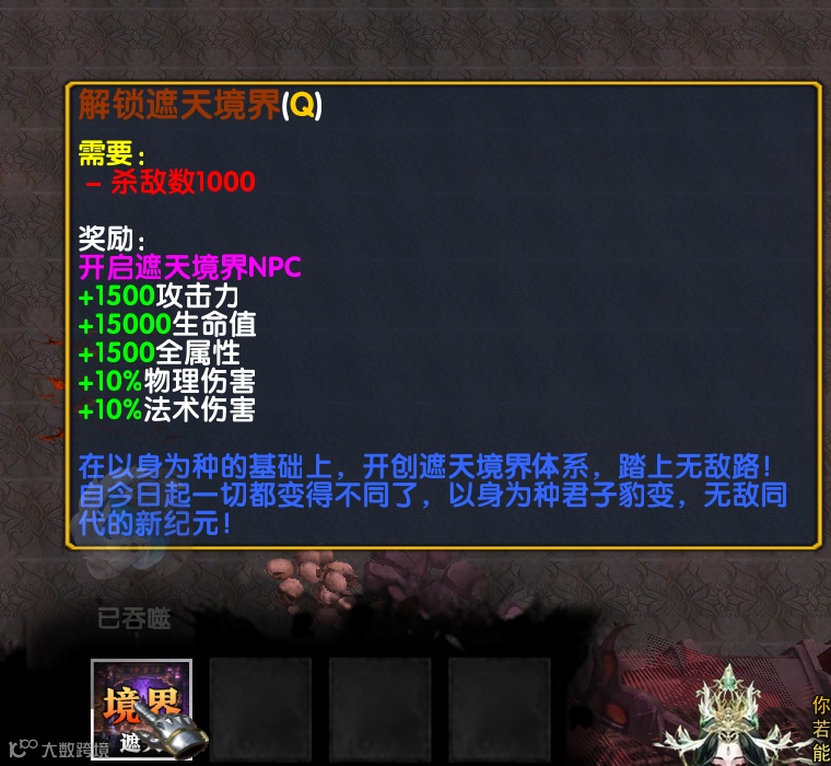 20级后解锁遮天境界,需要一千杀敌数,可以理解为多了一个提升属性的渠道。