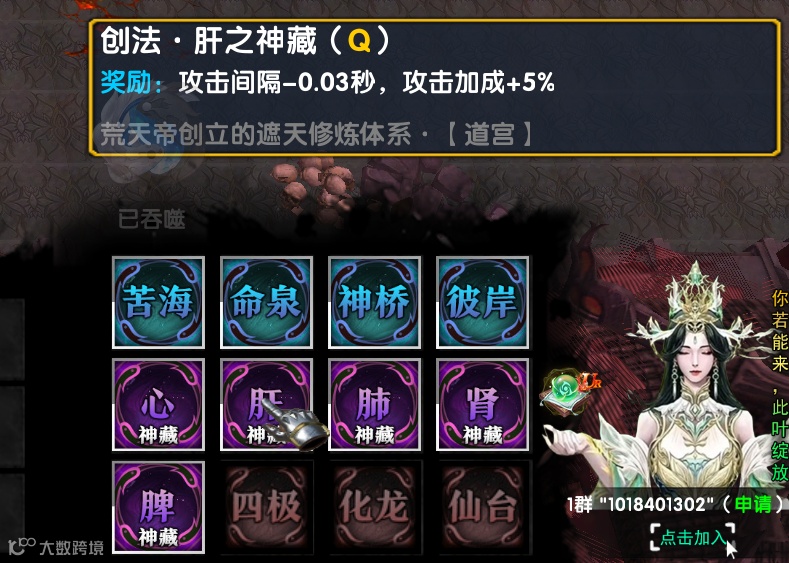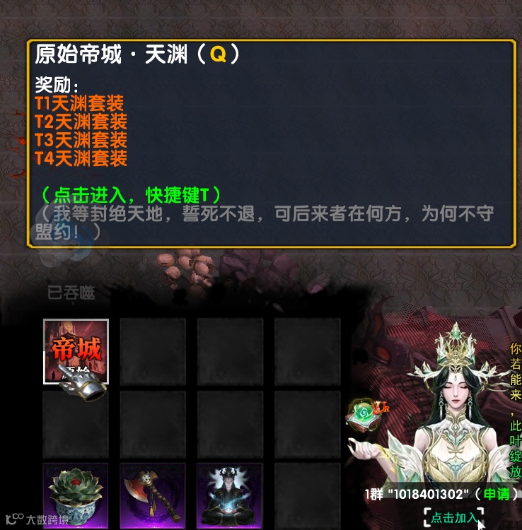 突破一定层数后,觉得自己战力够了,这时可以去原始帝城·天渊(按T进入)刷装备,天渊套装是毕业装,从T1到T4循序渐进,能有效提升你的属性。