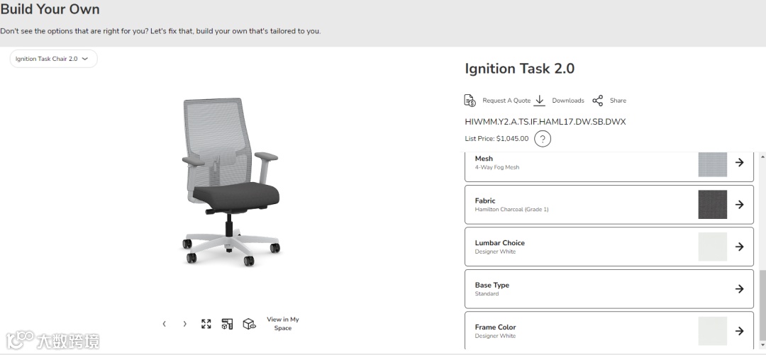 HON允许客户在单品层面选择尺寸、网布、面料、腰托、框架颜色等配置,并同步生成型号与报价,支持下载、分享与询价。这样一来,客户在前期就能完成外观、功能和预算的组合判断,而不是依赖销售反复沟通。同时,这也向采购方传递了一个信号——品牌具备成熟的模块化设计与交付体系,而不是临时拼凑方案的供应商。