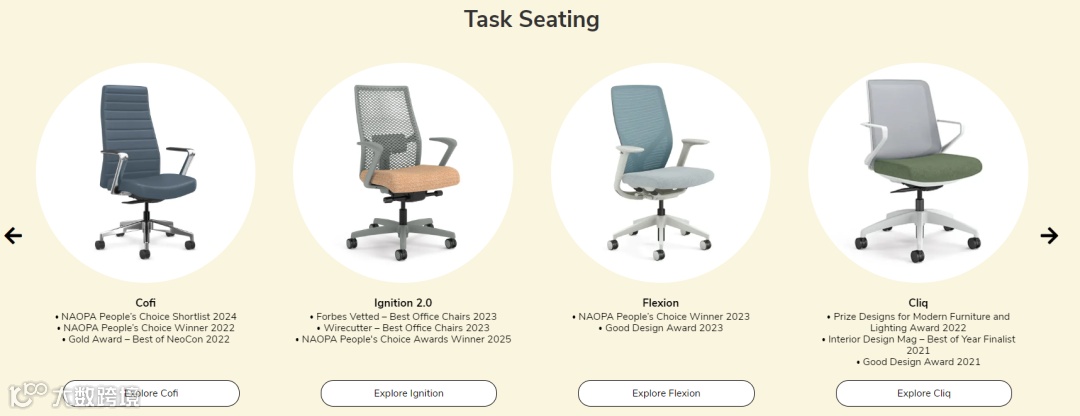 在高金额、长期使用的采购中,仅凭官网描述很难判断产品的真实水平。为增强信任,HON将来自NAOPA、Good Design Award、NeoCon等机构的奖项集中展示,并覆盖多个产品线,形成系统化的荣誉矩阵。
