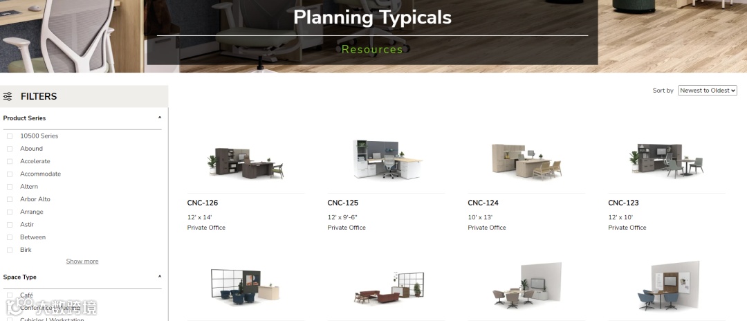 HON在官网展示案例时,没有采用“成功故事”式叙述,而是将其设计成高度标准化的“空间解决方案模板”,包括明确的空间类型与尺寸、对应具体的产品系列,并用关键词标注功能属性与使用场景,同时提供完整的BOM、DWG、SktechUP、Revit等工程文件。