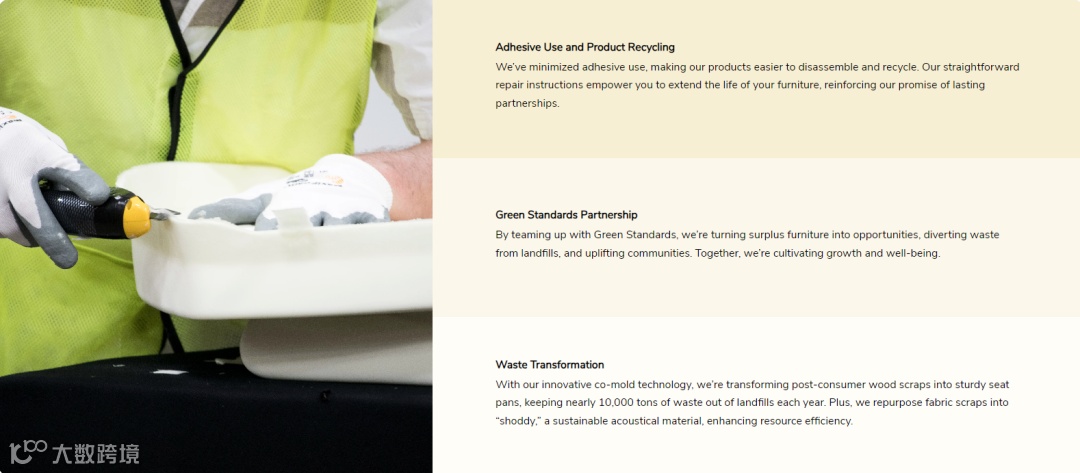 HON在官网系统性展示了从生产流程、材料选择到包装与产品性能的可持续实践,包括库存家具社区再利用、减少垃圾填埋、使用可回收材料替代泡沫包装等。