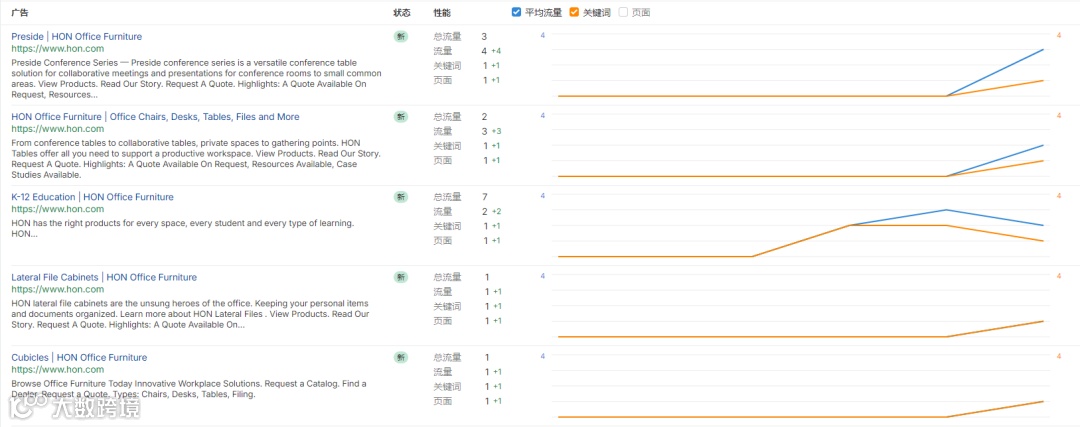 此外,从关键词和流量规模,我们可以看出,HON的广告更偏向于防御型与精准覆盖型投放,主要针对品牌词、产品线词和垂直场景词进行补充投放。这一方面可以防止竞争对手抢占品牌词或核心品类词的广告位,另一方面可以确保高意向客户优先进入HON体系。
