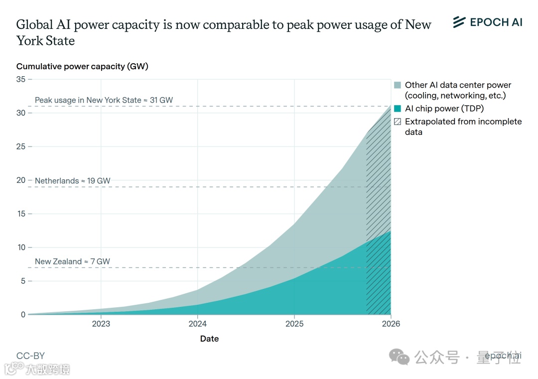 根据Epoch AI的最新估算,数据中心如今的耗电量已经达到30 GW,相当于纽约州在一年中最热时的用电峰值。