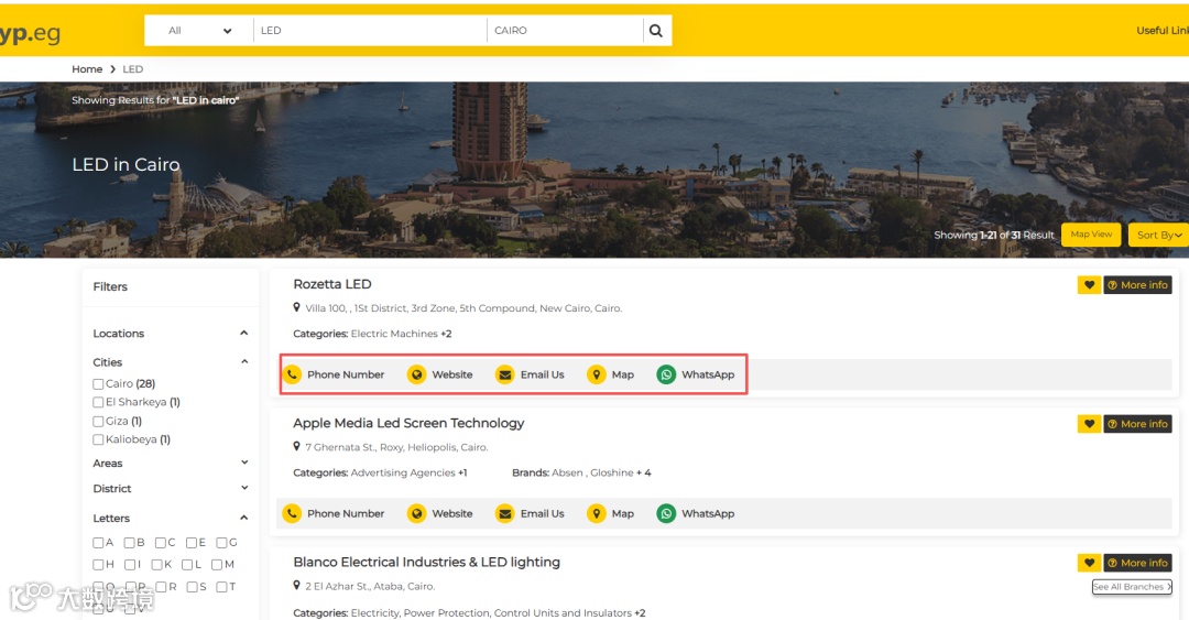 这个是yellowpages的埃及分站,这个黄页非常的不错,客户信息比较齐全,而且联系方式非常齐全,网站、电话、邮箱都有,更关键的是连WhatsApp都是有的,确实非常的不错。